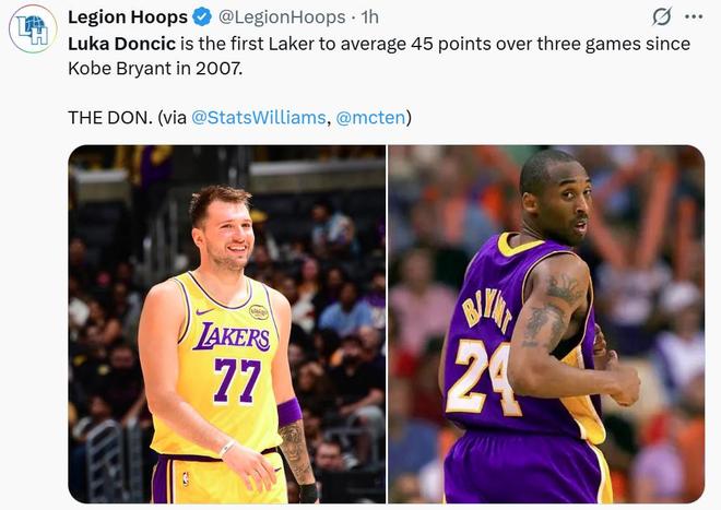 他也成为07年科比之后,湖人队首位在开季前三场比赛中场均拿下45分的球员。