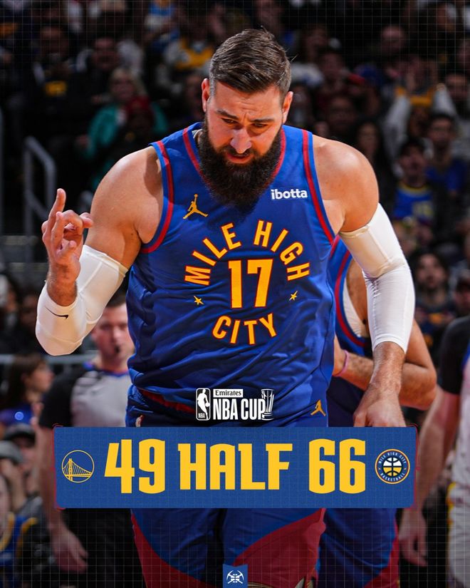 北京时间11月8日,NBA新赛季NBA杯继续进行,丹佛掘金队(6胜2负)延续连胜。约基奇送出26分、9个篮板和9次助攻,穆雷得到23分,他们率队前三节确立大比分优势,掘金队在主场以129-104大胜金州勇士队(5胜5负)。掘金队拿到3连胜,勇士队遭遇2连败。